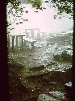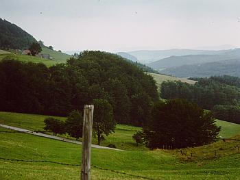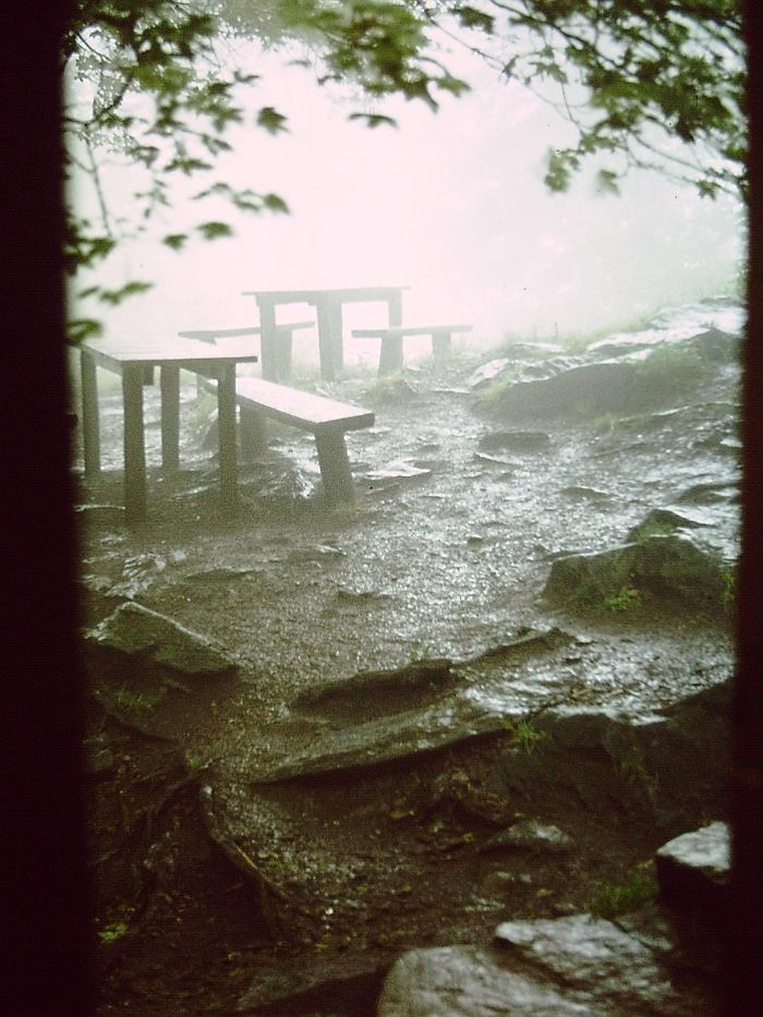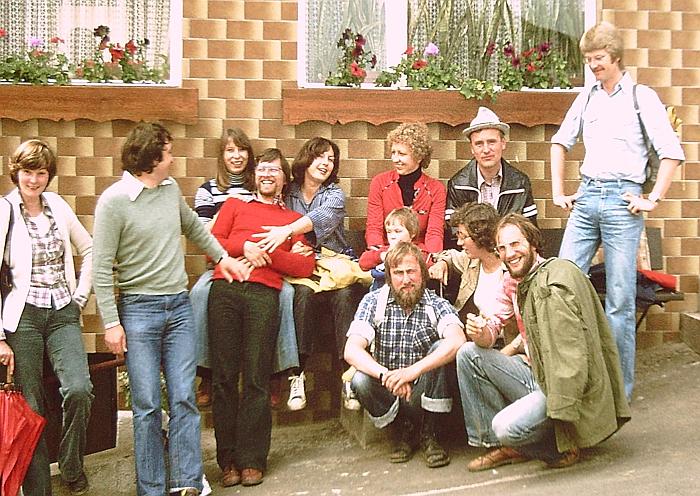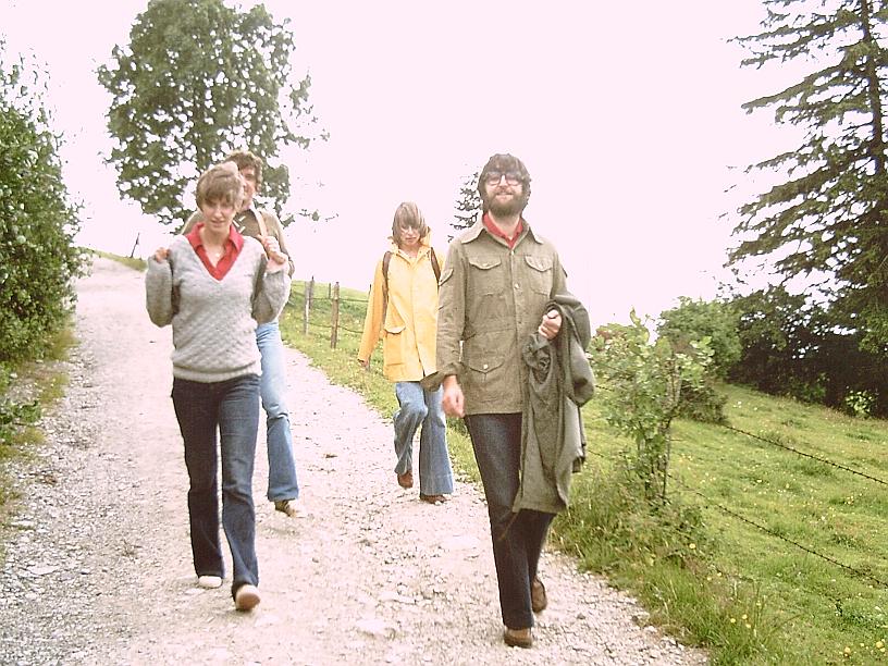 unser deutschfachberater z. war ein begeisterter wanderer und so wanderte ich wieder wie schon zu hannover-kolleg-zeiten, diesmal in der schönen rhön. unsere wandergruppe war leicht unterschiedlich besetzt. angesprochen waren alle aus seiner betreuungsgruppe, also nicht nur wir aus fulda, sondern auch die aus den nachbarorten, sofern sie zum einzugsbereich des seminars gehörten. links ein foto, das auf einer der wanderungen gemacht wurde. wahrscheinlich hatte ich da gerade geburtstag gehabt oder sowas. das zweite bild zeigt norbert vorne, ein referendar, der in bad hersfeld unterrichtete. norbert war ein ganz normaler mensch und vor allem unheimlich nett! ich betone das, denn es wird schrecklich. hinterher erfuhren wir, dass er depressionen hatte, keine ahnung wieso, wir hatten nichts gemerkt. zwei oder drei wochen nach einer unserer wanderungen war er mit seiner freundin auf der autobahn unterwegs, sie fuhren auf einen rastplatz und anstatt zum rasthaus zu gehen, wie eigentlich geplant, wandte er sich zur fahrbahn und lief absichtlich auf einen lastwagen zu. er war sofort tot. ein schock für uns. in der todesanzeige seines kurses hatten sie an seinen unterricht erinnert, wo in einem text fragen des lebens angesprochen waren. gegen ende unseres referendariats wollten wir noch eine große abschluss-wanderung unternehmen, in den ferien. unser betreuer winkte aus familiären gründen ab und wir planten eine mehrtägige wanderung. zwischendurch wollten wir abends immer schön gemeinsam speisen - mitten in der rhön. aber der wettergott war uns nicht wohlgesonnen, unser erster tag ging mit sonne los und dann in immer stärker werdenden regen über. diesen abend verbrachten wir aber immerhin wie geplant, im rhönhäuschen. (foto oben) da es am nächsten tag nicht besser wurde, wurden autos geholt und wir wollten was besichtigen. aber der regen nahm uns das vergnügen und so beendeten wir unsere aktion am zweiten tag. schade.