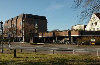 das nur auf diesem foto wuchtig wirkende gebäude. rechts eine aufnahme