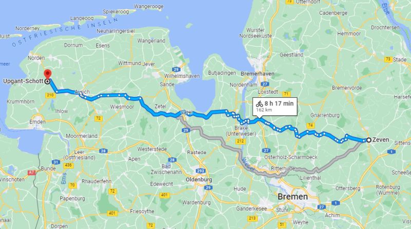 Der erste Abschnitt geht am 2. Mai bis Brake, per Fähre über die Weser. Ach, noch weiter, sogar bis Varel hab ich jetzt geplant, ins Hotel Friesenhof.